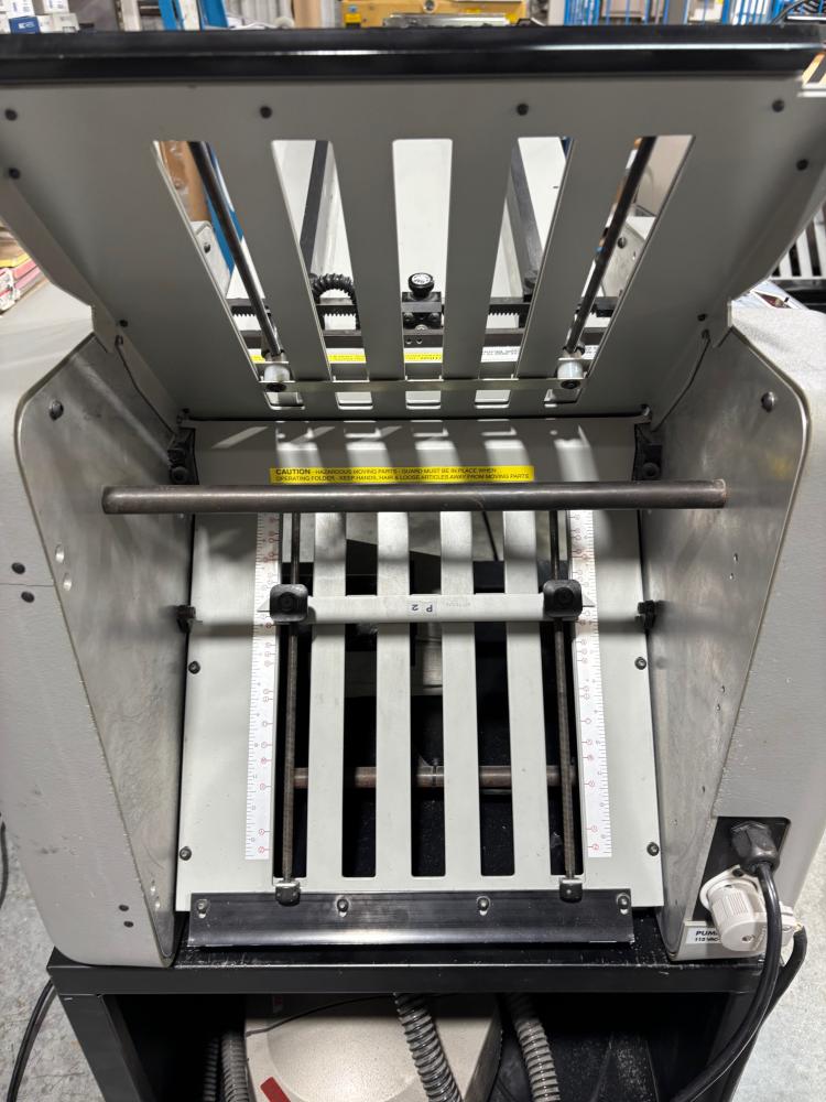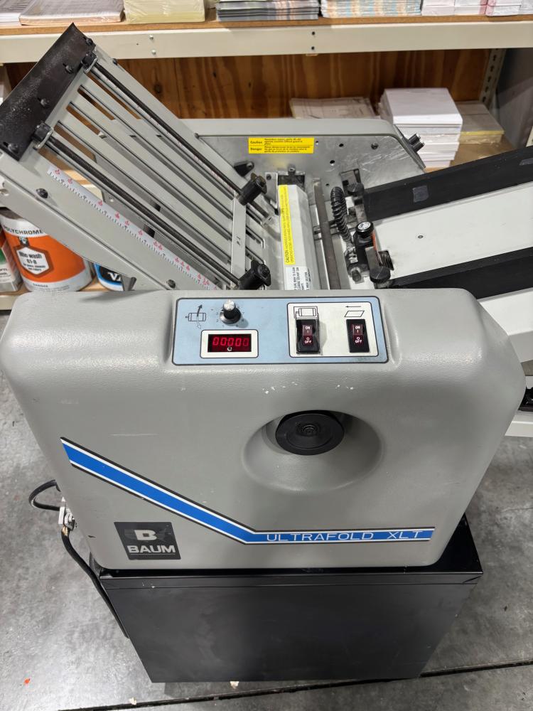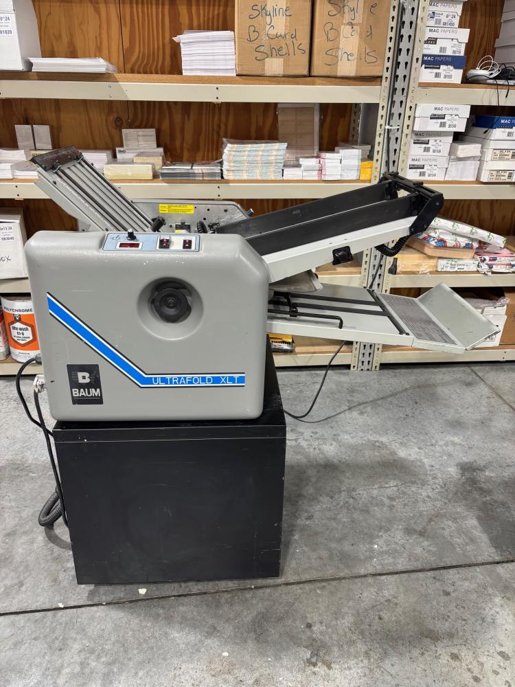 Baum 714 XLT Paper Folder. 14"x20" Max size. Rated at a max speed of 35,000 sheets/hour per manufacture specs. Has combo rollers. Runs and operates great.