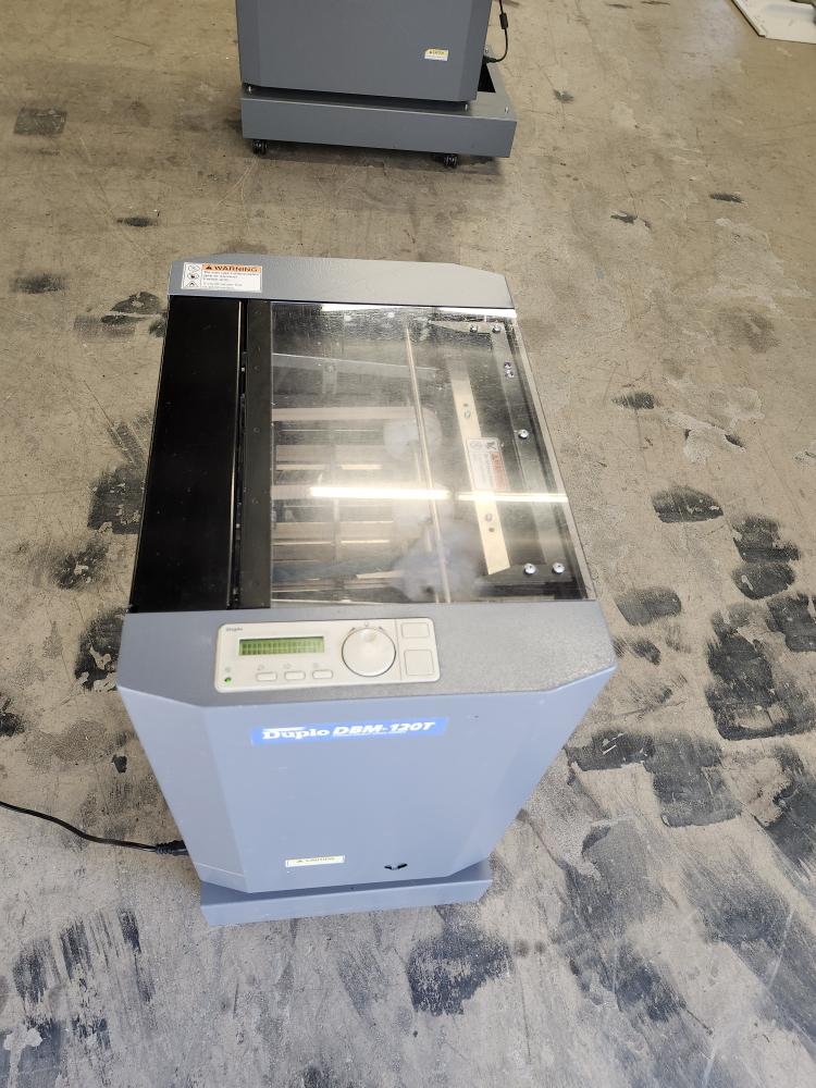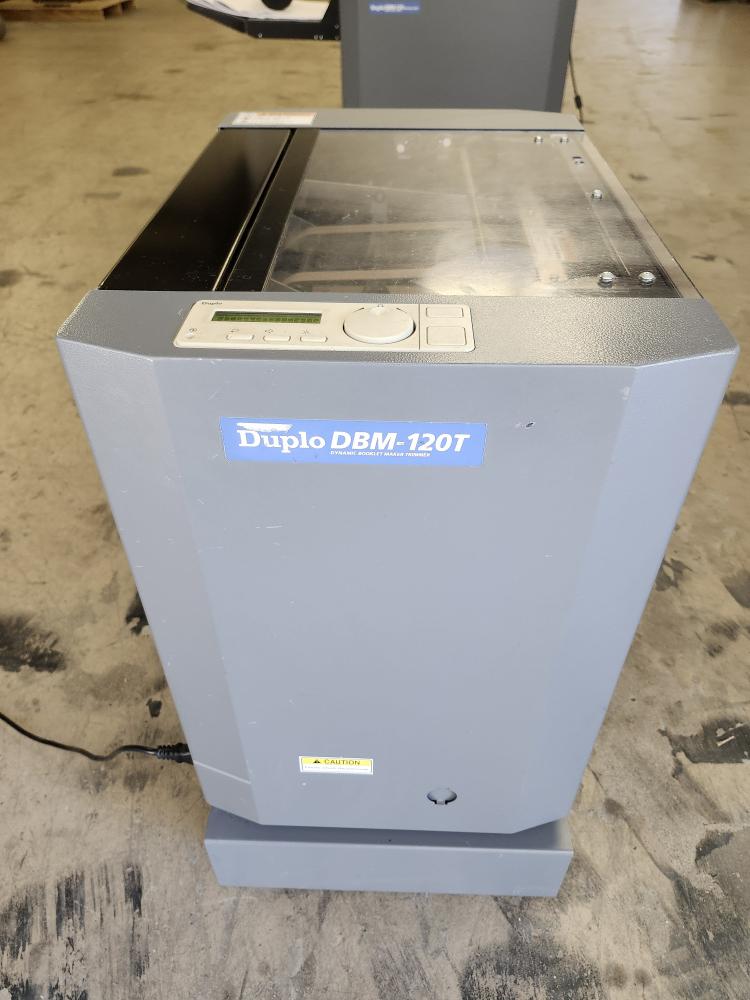Duplo Trimmer Model DBM-120T. 120 Volt, 10 Amp, 60hz. SN 060600183. Designed to be used in-line with the DBM-120 Booklet maker. Last job done was 8.5"X12" cardboard cut to 8.5"X5.5" Trimming :-20. Shipping weight 124 Lb. Sheet capacity 20. Height 23" X Depth15" X Width 22".