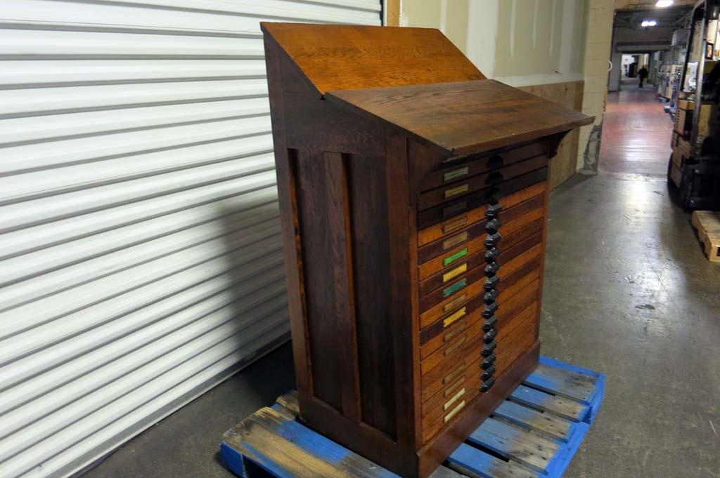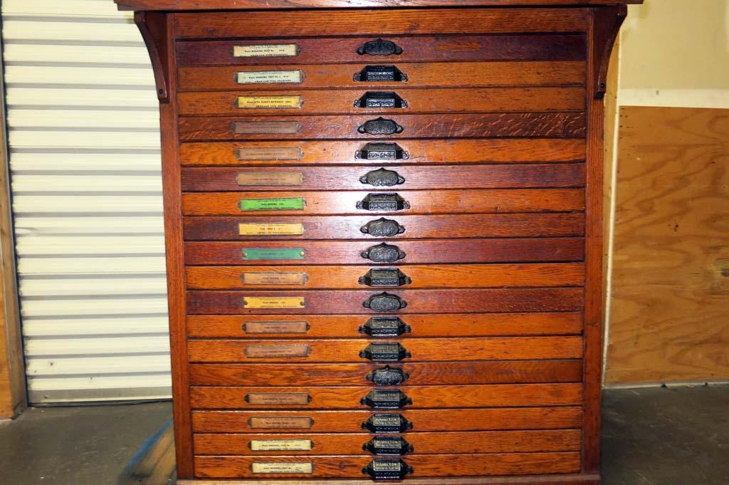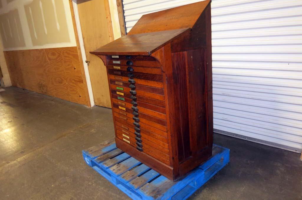 Lot #64: (100 Years Old) Hamilton 18 Drawer Letterpress Type Cabinet FULL OF TYPE w/ Composing Top